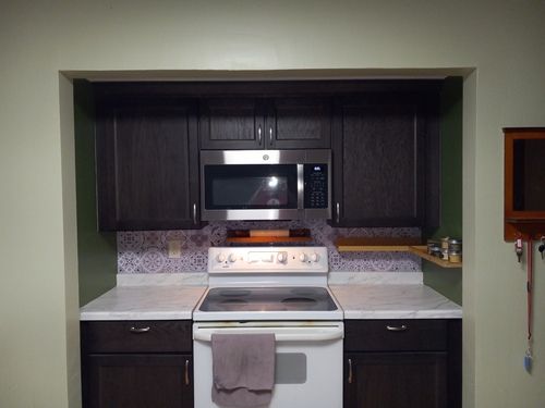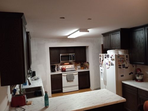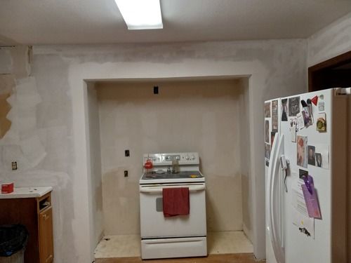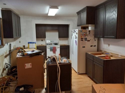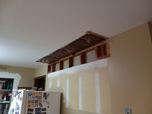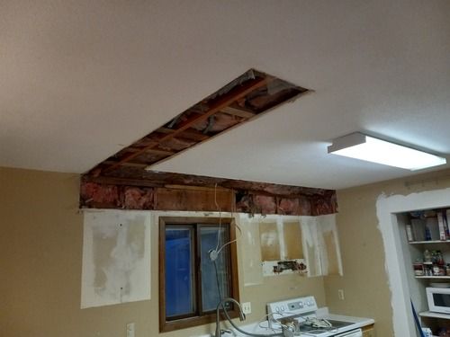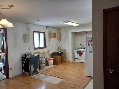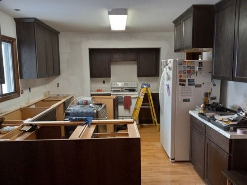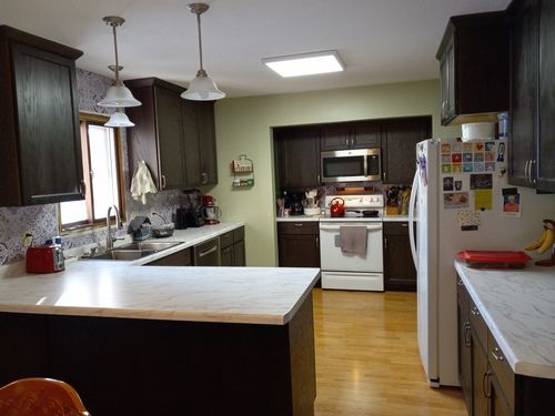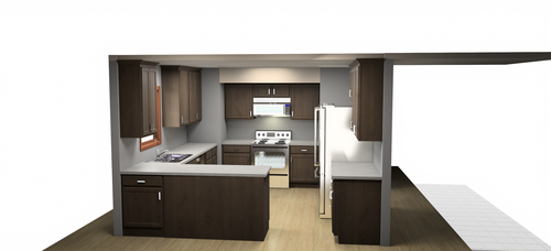 The gutters are already replaced and other projects are currently under way. The kitchen (3D Image provided below) and carpeting are next to be updated. The addition floor was taken up to gain access so changes could be made to the HVAC. To adjust to the kitchen remodel, new furnace exhaust pipes were rerouted and installed. In the plans, the pantry will be eliminated so the oven can take its place. The microwave and dishwasher will be moved to make the kitchen more user friendly. Also, the cabinets will rise to the ceiling with no soffit. Electrical and demolition work is still to come.